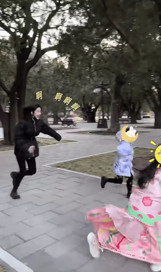 下图中颖儿正陪着两个孩子玩“老狼老狼几点了”的游戏,和女儿们追逐打闹的她脸上挂满笑容,比两个孩子玩得还开心。