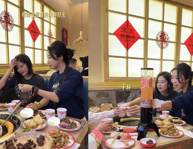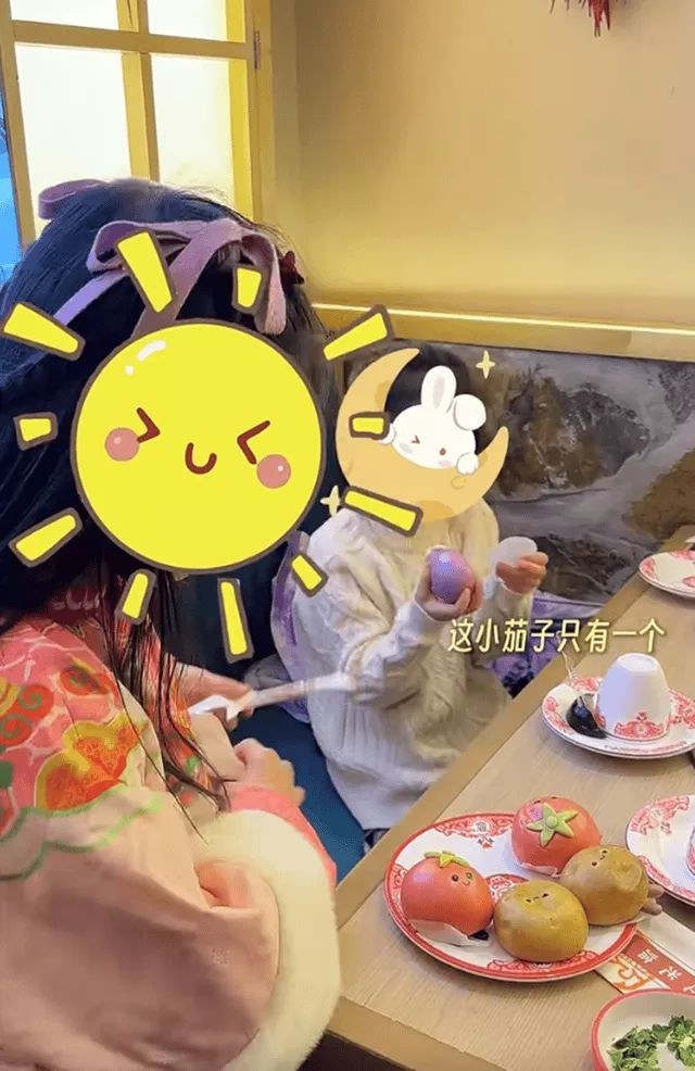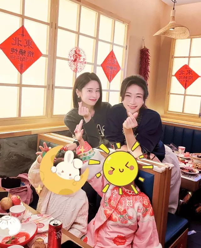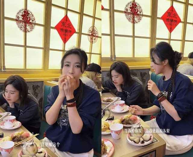 逛完太庙,颖儿王骏迪带着女儿们吃铁锅炖,吃饭时两个小朋友也是形影不离坐在一起,玩得超好。