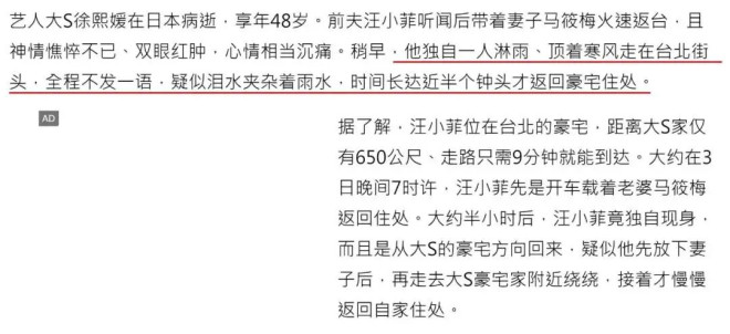 陪着汪小菲一同回到台湾的还有他的现任妻子Mandy,汪小菲把妻子送回住所之后又独自一人外出。而台媒拍到的画面,是汪小菲独自一人在街头不发一语地慢步,淋着雨从大S的住所方向走回自己在台湾的家。