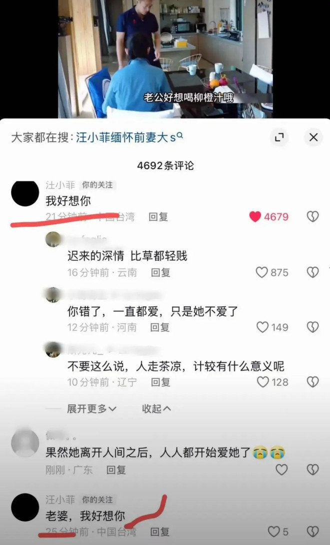 汪小菲似乎生怕自己深情的行为还不够直接,于是干脆在社交平台上观看了他曾经跟大S一起录综艺的恩爱片段,并留下了让人震惊的评论“老婆我好想你”,后面知道自己的留言不妥,把“老婆”二字删掉又留了一条“我好想你”。