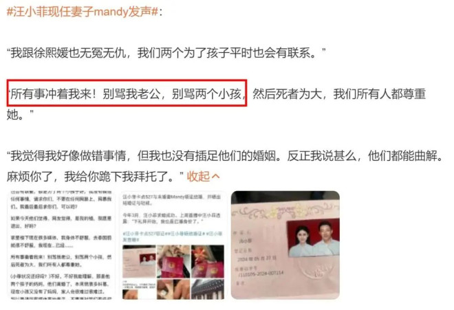 汪小菲刚消停一会儿,他的现任妻子Mandy又来了,,一边哭泣一边接受采访,恳请媒体放过汪小菲和大S的家人(包括两个小孩),呼吁网友不要网暴,并称“所有事都冲我来”。