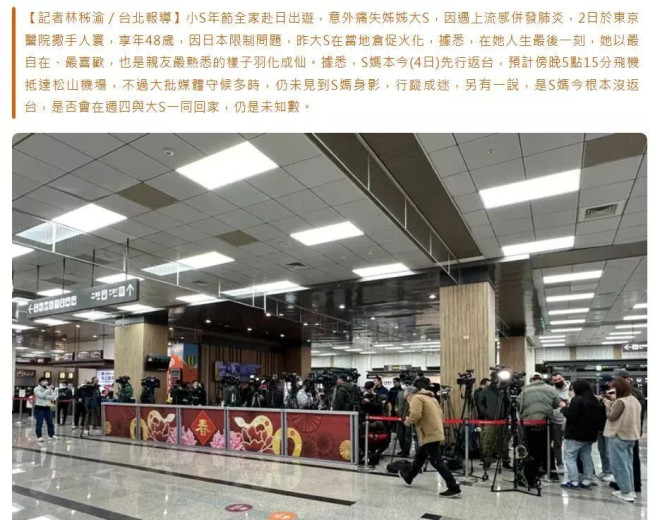 目前大S的遗体已经火化了,之前台媒曝徐妈妈带着两个外孙先一步回台提前准备葬礼事宜,但飞机落地后没看到S妈,行踪成谜。或许是等到6日,她和具俊晔、小S一起带着骨灰回来。