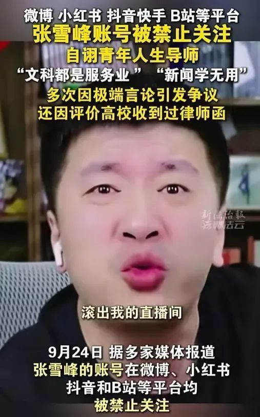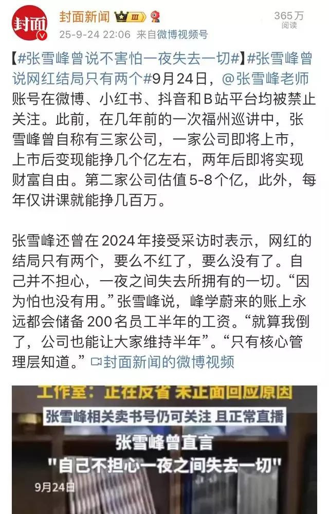 9月24日,张雪峰的抖音账号突然“被禁止关注”,接着是小红书、微博、B站接连“沦陷”。四大平台齐封杀,6000多万粉丝顷刻归零。