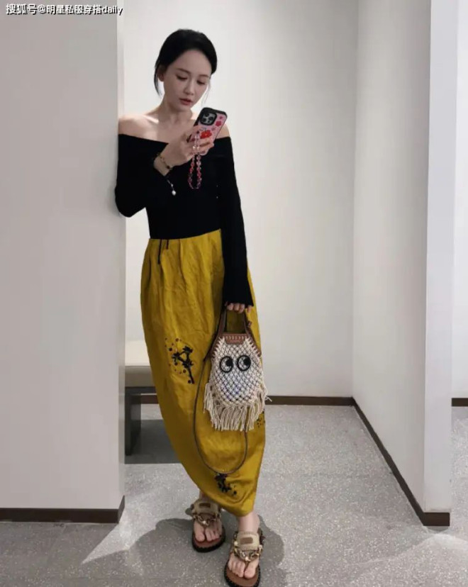 下半身则选择一眼惊艳的亮黄色长裙,这种色彩和深色系搭配,会中和深色系的沉闷感,让人的穿搭眼前一亮!陈乔恩这一身色彩搭配,简直“心机满满”!