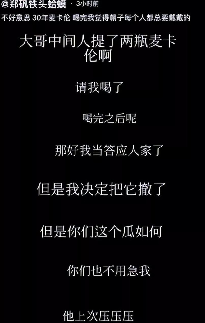 这些细节都让网友的猜测越来越明确。可就在大家等着更多实锤的时候,郑铁头突然删光了所有爆料视频,只说有神秘人找中间人调解,送了两瓶贵价麦卡伦威士忌,这事就先翻篇。