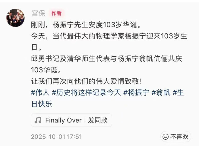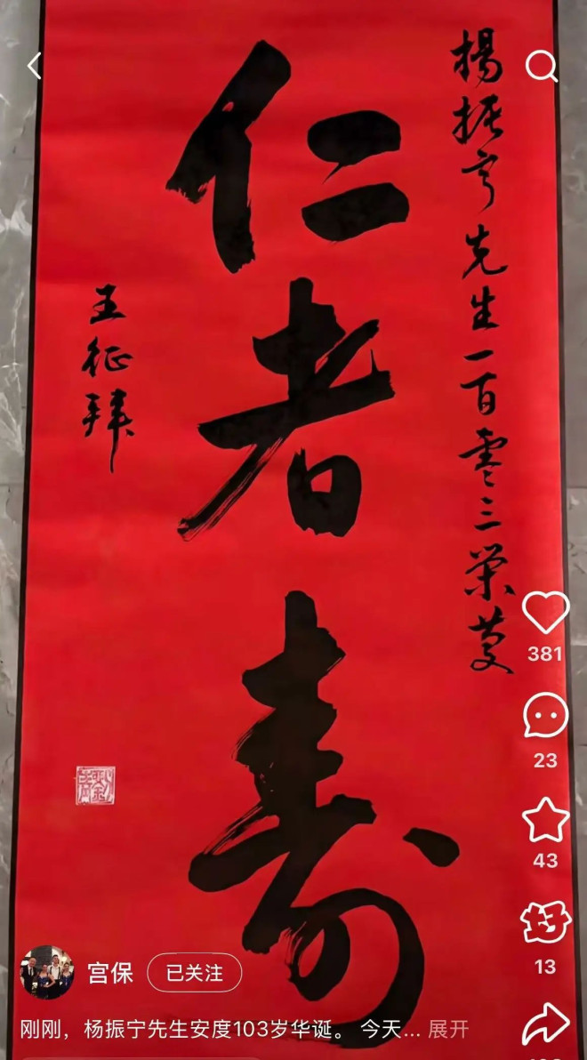 王征留言:当代最伟大的物理学家杨振宁迎来了103岁生日。邱勇书记(清华大学党委书记)以及清华师生代表,与杨振宁翁帆伉俪共庆103华诞。让我们再次向他们伟大的爱情致敬。