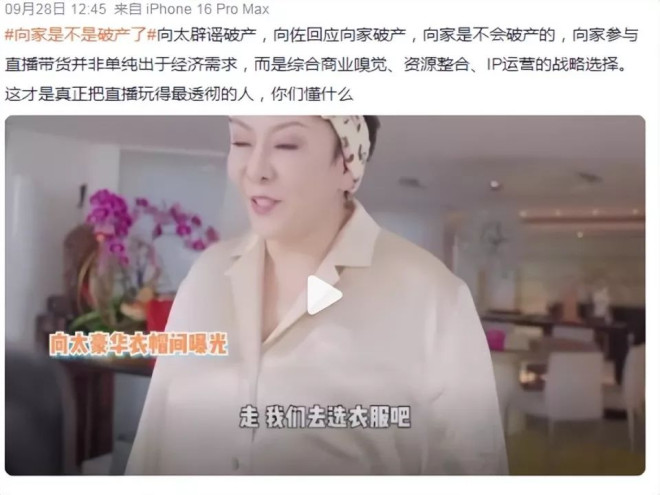 一部分人认为向家不可能破产,向太“屈尊”直播、向佐挑战女装等做法,都是老钱家族在综合了商业嗅觉、资源整合等的一种战略选择;