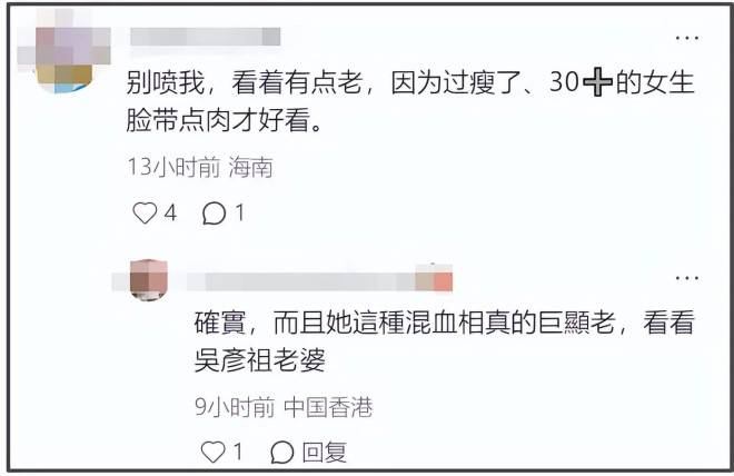 像昆凌这样的混血长相并不少见,20多岁的时候绝美,但一旦过了25岁后五官骨骼进行二次发育,整个皮肤状态都迅速衰老化,有网友认为这可能是白人基因花期短的缘故。但也偶有例外,比如许玮宁,花期极长,皮肤五官变化一直没太大变化。但昆凌不一样,老态一露就不会因为打扮年轻而有所改变。