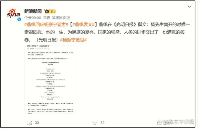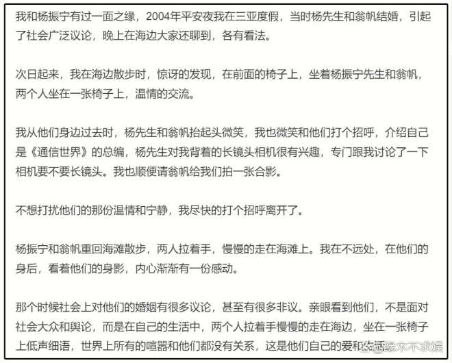 翁帆的悼念不掺杂情感纠葛,而是以一位仰望者和陪伴者的姿态,讲述杨振宁波澜壮阔的一生。尽管她未曾直言,外界却从中窥见了她与杨振宁间的深情,知情人士纷纷曝出两人爱情的点滴细节。