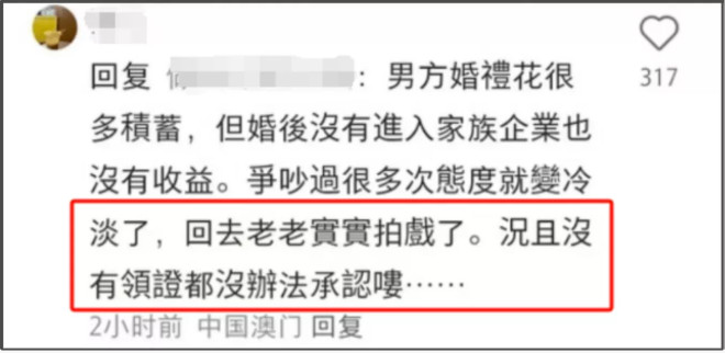 还有网友觉得赌王三房太抠门了,对儿媳妇和女婿都利用完就抛弃,窦骁已经做的很好,婚礼都是他全包,结果婚后天天防着他,普通人对关系利益复杂的豪门还是敬而远之吧。