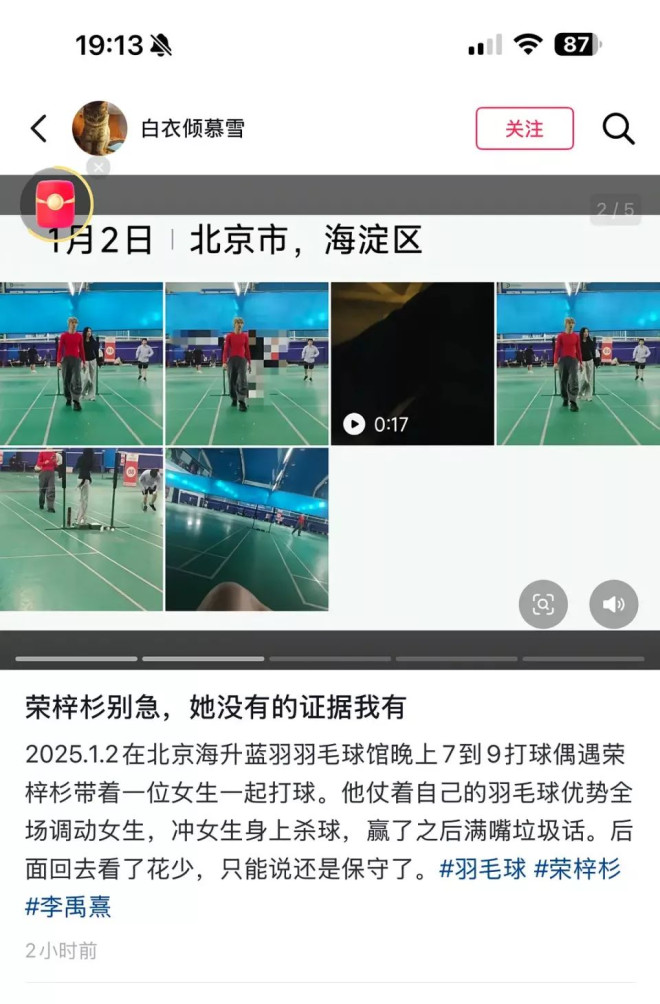 今天下午有热心的朝阳群众,晒出自己今年1月2日在某场馆打羽毛球的照片,网友说自己当天晚上7点到9点,偶遇荣梓杉和一个女生一起打羽毛球,荣梓杉全程对女生非常不友好,时常冲女生身上杀球,赢了还满嘴垃圾话,让人观感很不好。