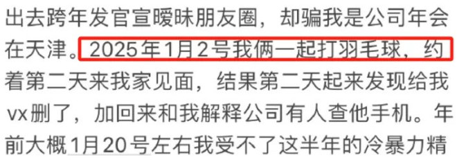大家记住1月2日这个时间,再回看李禹熹昨天的爆料,她里面提到一个细节,两人1月2日一起打了羽毛球,这就对上了。