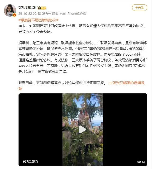 然而,钱的问题只是开胃菜,真正的“硬菜”是那份协议。网传这份文件厚达28页,核心条款要求夫妻财产完全隔离,确保何超莲名下资产独立;明确限制窦骁参与家族生意;甚至还包含特殊条款,例如若婚姻维持不满3年,男方所持股权需被折价清退。爆料称,窦骁对此的回应相当硬气,一句“结婚不是开公司”,直接让签字仪式告吹。