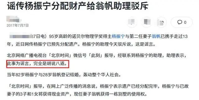 比如什么遗产分配案出炉,翁帆只获得一套别墅居住权,现金资产全给了前妻的三个孩子等等。其实,早在8年前,杨振宁的助理就已经站出来辟谣过了。