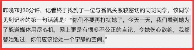 媒体们不甘心扑了个空,随即又把目光投到了翁帆的同学上,试图在同学身上获取翁帆的一些私密事情。