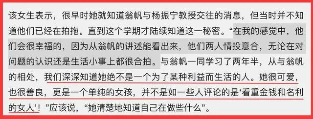看得出,只有真正了解翁帆的人,才会明白其中原委。这个世界上所谓的爱情有很多种,有人钟情于外貌,也有人钟情于物质,而翁帆的爱情则是始于崇拜,对杨先生品德学识的仰慕。
