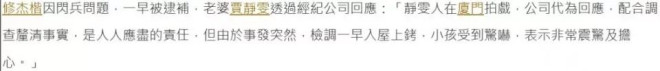 根据网络上曝光的消息,当天执法人员一大早就到贾静雯的家里将修杰楷铐上带走调查,然而身为妻子的贾静雯则还在厦门拍戏。