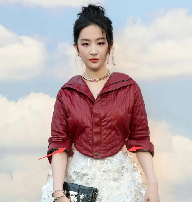 当天刘亦菲的造型、妆容都是一言难尽。她穿了一件枣红的短款皮衣、还挽着袖子,露出了壮实的手臂。