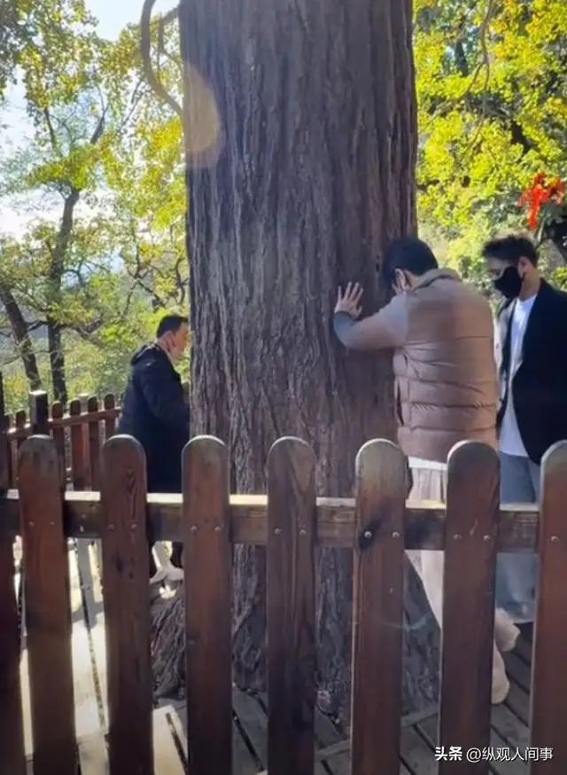 照片中,只见辛柏青和李乃文正围着一棵大树祈福,俩人的脸上都神色严肃、看不出一点高兴的样子。