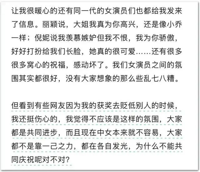 “大家在各自的作品里熠熠生辉,而我是最幸运的那个。我知道我们一直努力的是什么,我们选择站在这里,不是因为我们有多年轻漂亮,不是因为我们把家庭事业平衡得很好,也不是因为我们穿了新一季的漂亮衣服,而是因为我们有创作能力,我们有能力成就一部作品,我们有能力成就一个角色......”