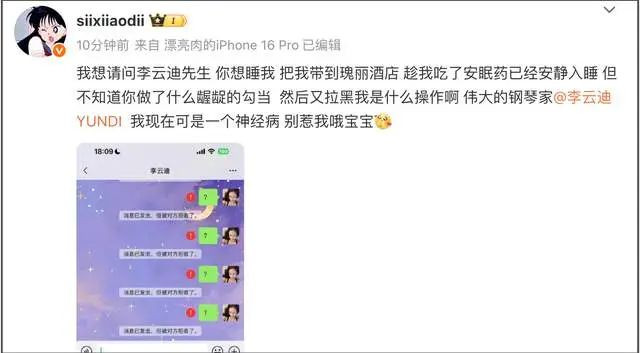 李汶翰前女友司晓迪突然发文,艾特李云迪,自曝被李云迪带到酒店,趁她吃了安眠药,做了龌龊勾当,等再联系李云迪的时候已经被拉黑了,因此情绪失控,发文控诉李云迪别惹自己。