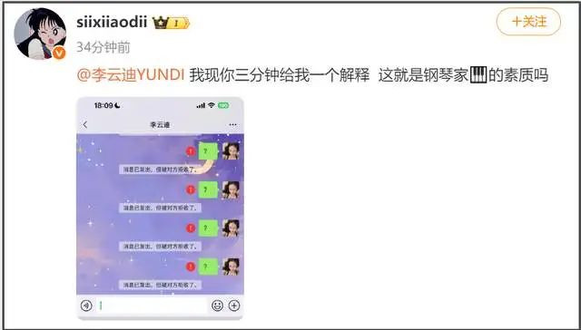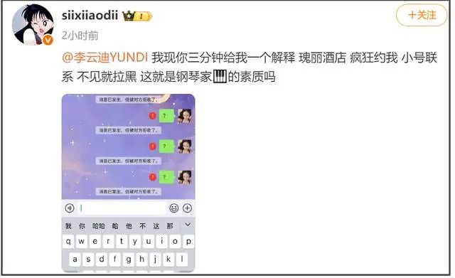 从女方爆料的信息看,李云迪似乎对她并没有上心,只是疯狂想约她,约不到就拉黑了。女方发现后就恼羞成怒开始发文喊话。其实男的目的不纯的话,没必要因为拉黑而生气,远离这种人才是最好的, 也是不懂司晓迪为啥那么暴怒。