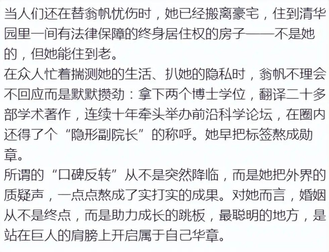 当然了,这是翁自己的选择。当年,她如果不选择杨,凭她的条件,也能嫁个不错的人,结婚生子,孩子应当也上中学了,也能活出另一个不错的人