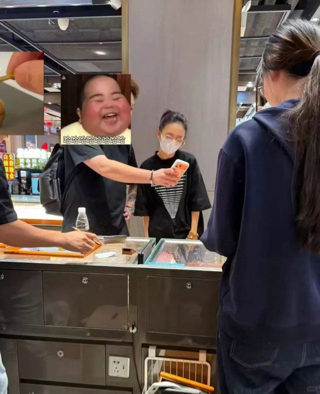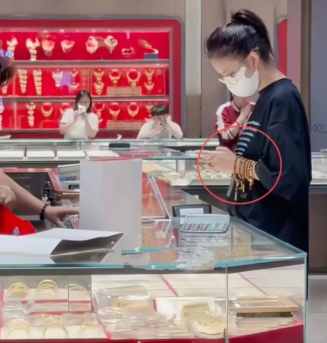 她戴着口罩和眼镜,脸上应该是素颜状态,想来她是刚回酒店卸了妆后就来水贝买黄金了。