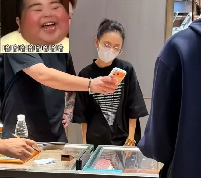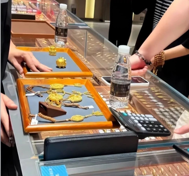 在曝光的画面中,她扎着高马尾,穿件几百块的黑色T恤,趴在黄金柜台前认真挑选,时不时还跟助理商量。