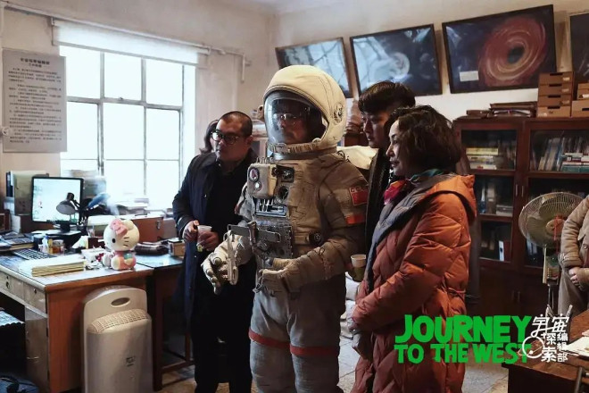 如图所示,吴京穿的是厚重、笨拙的宇航服。这一套穿上和脱下来都很麻烦,需要几个工作人员同时操作,花不少时间才能完成,《宇宙探索编辑部》里有过穿脱的镜头,最后因为机关卡住头盔开不了,人在里面差点没憋死,虽有艺术创作成分,但大部分镜头都是真实的。