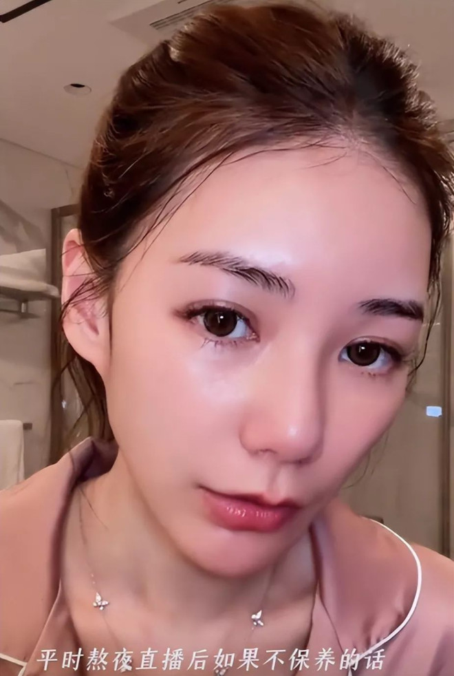 由于她经常熬夜直播,所以脸部状态会变差,她推荐了一款精华油,对着镜头向大家展示。