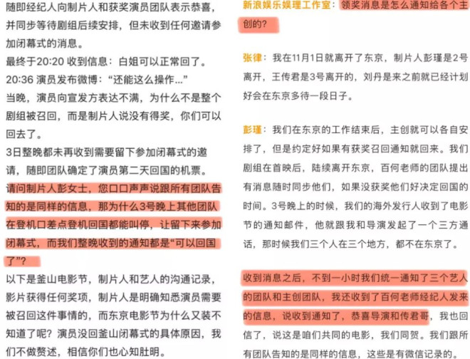 但在导演张律与制片彭瑾的采访中,事情完全不是白百何说的那样。