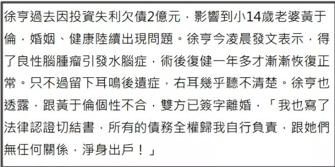 还好,徐亨还算有担当,很明显,声称因性格不合离婚,是徐亨努力保留的最后一点体面,中年夫妻无法走下去,多半是因为还不完的债,离了婚的徐亨直接净身出户,同时强调由他一人承担所有债务——此时徐亨还有2亿台币欠债没还,也就是4000多万人民币。