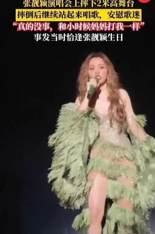 2017年,张靓颖在酒店楼梯意外摔倒,膝盖磕出淤青,依旧被要求带伤完成演出。