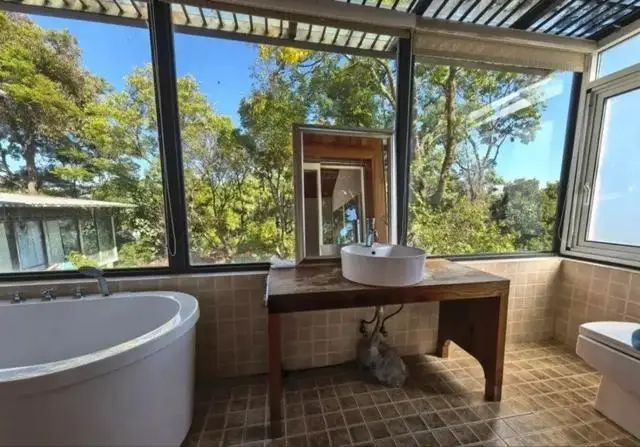 只是,这卫生间的位置合适吗?三面窗户,外面的景色一览无余。