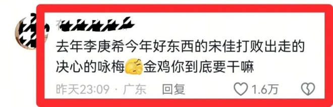 有网友指出,“去年李庚希,今年《好东西》的宋佳,打败《出走的决心》的咏梅,金鸡你到底要干嘛”。