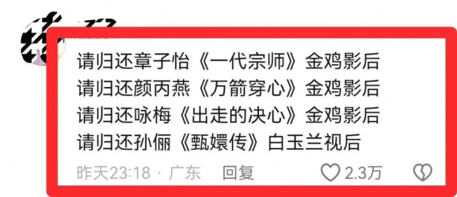 有网友喊话,“请归还章子怡《一代宗师》金鸡影后,请归还颜丙燕《万箭穿心》金鸡影后,请归还咏梅《出走的决心》金鸡影后,请归还孙俪《甄嬛传》白玉兰视后”。