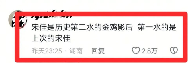 有网友直言,“宋佳是历史第二水的金鸡影后,第一水的是上次的宋佳”。