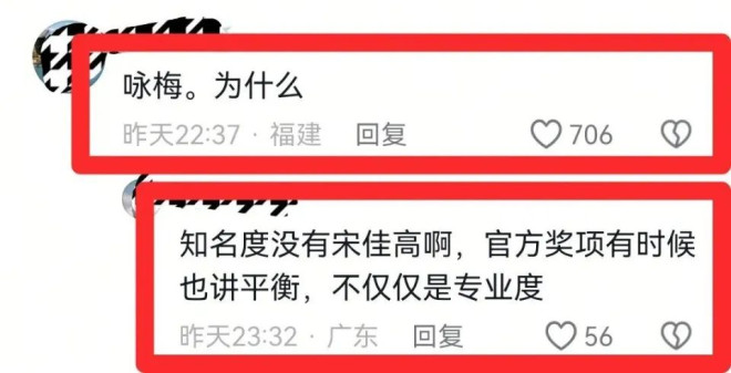 可惜,咏梅还是拿不到奖,正如网友所说,“知名度没有宋佳高,官方奖项有时候也讲平衡,不仅仅是专业度”。