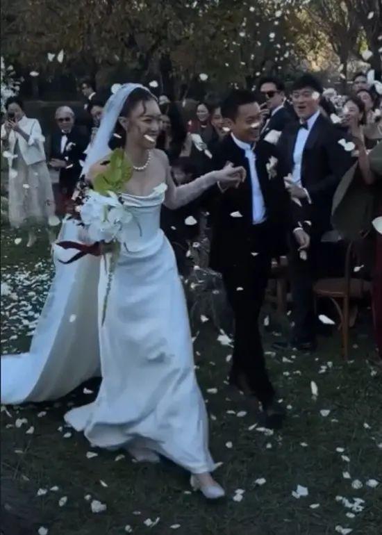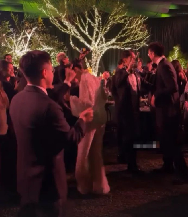 两人完成仪式后,亲友们向他们抛撒花瓣,霍启仁的父亲霍震霆及哥哥霍启刚站在前排位置,霍启刚忙着给弟弟录视频,而母亲朱玲玲身穿白色礼服,也拿着手机给儿子录像。