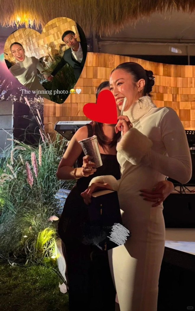 Namfon穿白色礼服亮相,笑容灿烂与来宾合照,小腹隆起疑似怀孕,还有一张是Namfon和闺蜜的合照,上方是霍启仁与妻子手牵手的爱心图,两位新人当天应该玩得很开心。