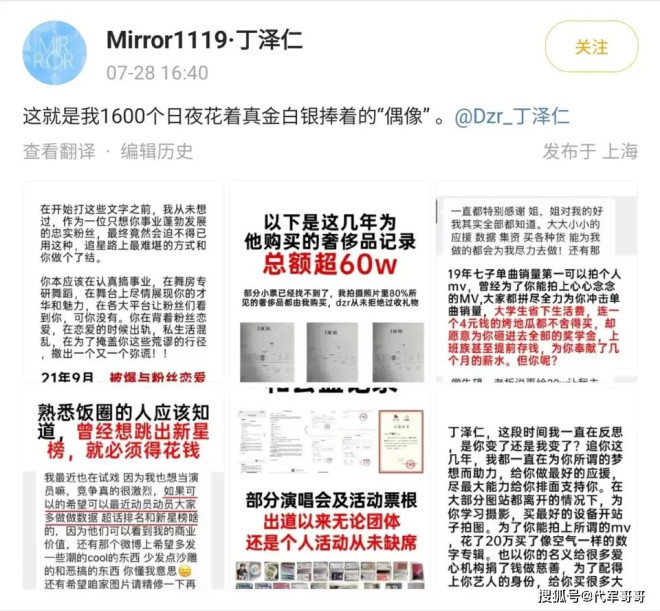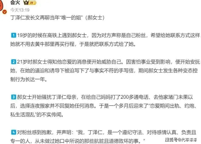这场控制与反抗的拉锯战在2024年夏天达到高潮。当丁家不堪200多次午夜凶铃式骚扰被迫搬家后,郝女士开始执行"毁星计划"。她精心剪辑的九宫格长图在微博引爆:伪造的酒店消费记录、经过消音处理的暧昧录音,最致命的是那张被胁迫写下的"情书"。48小时内,#丁泽仁塌房#话题阅读量破12亿,乐华娱乐市值蒸发近3亿。