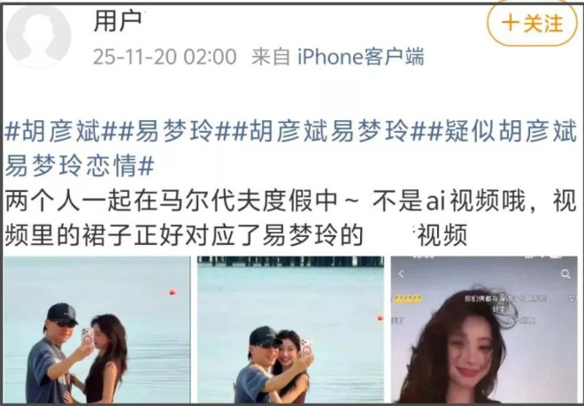 爆料网友透露胡彦斌和易梦玲正在马尔代夫度假,曝光的视频并非ai,衣服都和易梦玲自己拍的短视频对上了,易梦玲社媒IP定位同样显示在马尔代夫。