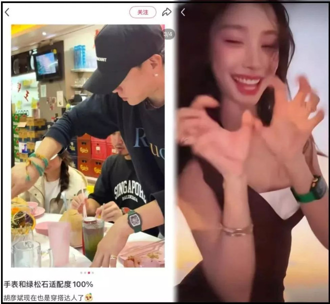 胡彦斌一早就戴上了情侣表,同款表还出现在易梦玲马尔代夫视频中;
