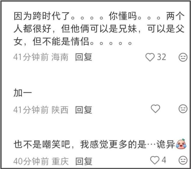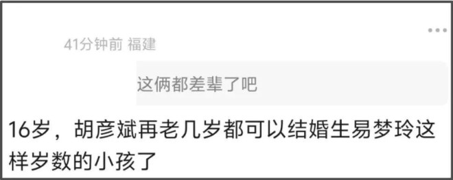 暂时不提胡彦斌和易梦玲互相配不配得上,主要是男方大了女方16岁呀,虽说十几岁的年龄差放在娱乐圈不算少见,但网友一想到胡彦斌努努力,从年龄上甚至可以生出一个易梦玲了,还是觉得有些不适。