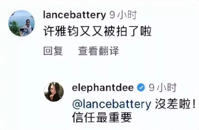 甚至当网友们热情的告诉她,许雅钧又被拍了的时候。她也只是坦然的回复,表示“信任最重要。