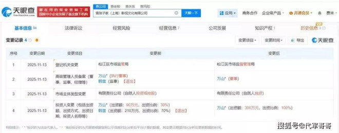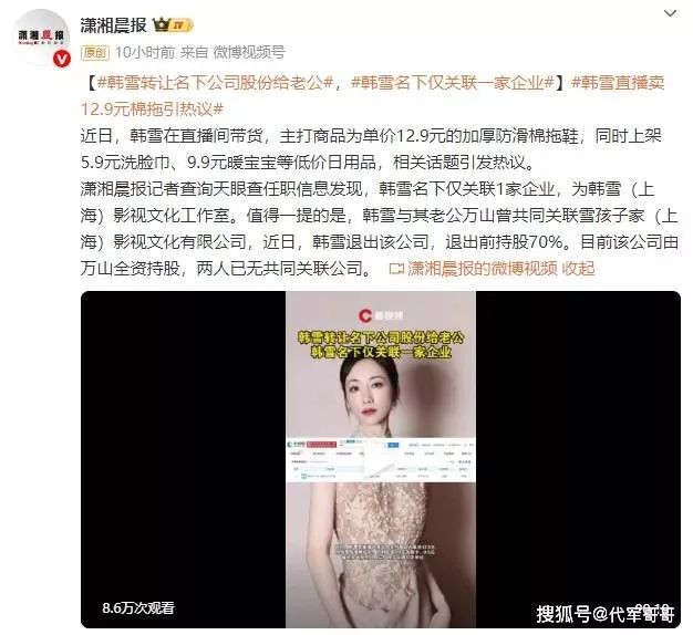 11 月 19 日,一则工商信息变更引起了媒体和网友的关注:韩雪退出与丈夫万山共同持股的 “雪孩子家(上海)影视文化有限公司”。在这之前,韩雪持有该公司 70% 的股份,是绝对的控股股东,而退出后公司由万山全资控股。值得玩味的是,这家公司是两人目前唯一的共同关联企业,韩雪的退出动作与她直播带货频次激增在时间上高度重合。