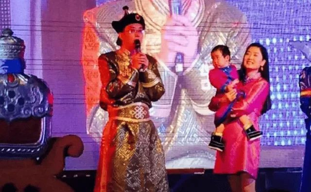 徐明朝则坐在老婆一旁,头上戴着与玲花同款情侣帽,穿着一件紫色蒙古袍,结婚14年的两个人越来越有夫妻相了。