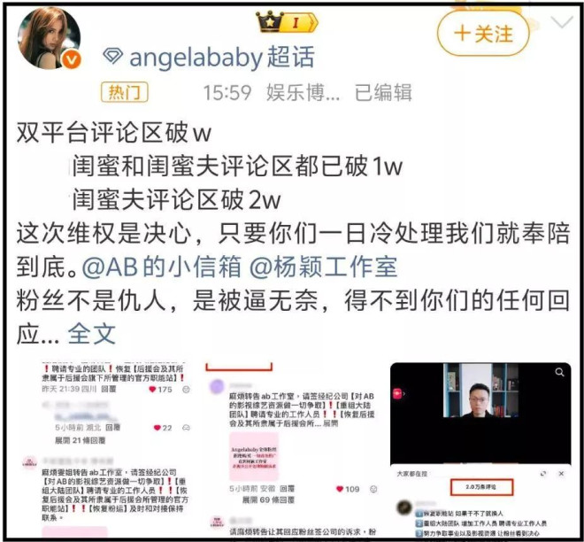 不知道外界有没有注意到,baby(杨颖)工作室评论区已经沦陷了好几天了,包括baby合作品牌的账号评论区都沦陷了,全是baby粉丝维权留言,各大平台加起来都有好几万条了,连baby闺蜜和闺蜜老公的评论区都没放过。