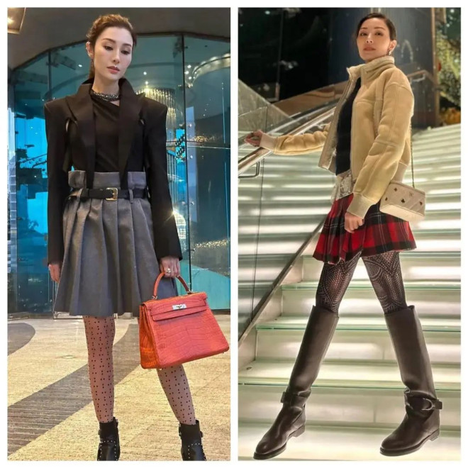这身近照颜色倒是低调了,但李嘉欣的黑色皮裤配蓝紫色高跟鞋,皮裙配网纹靴,怎么看怎么迷~
